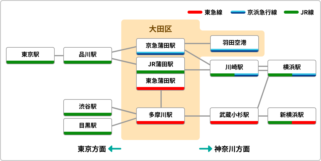 都心部はもちろん、横浜や川崎にも非常にアクセスが良く、都心のベッドタウンとしても機能しています。
