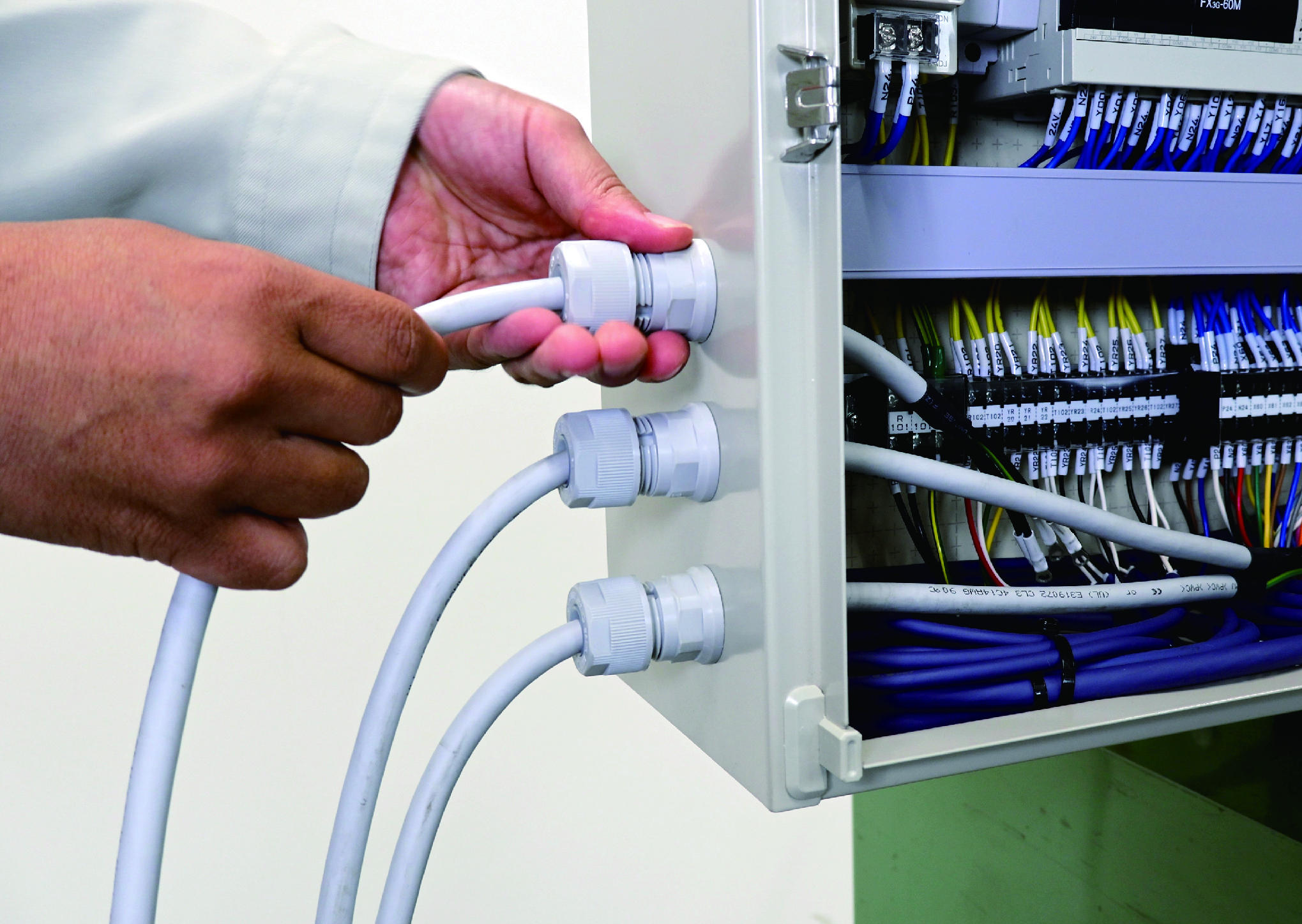配電盤などから電線ケーブルを引き出す部分に取り付けてケーブルを固定し水等の侵入を防ぐケーブルグランドの施工性を飛躍的に高めた製品です。従来のケーブルグランドは配電盤外側から挿入した本体を内側からロックナットで締め付けて固定するものが多いですが、大型の配電盤では内外に二人の作業者が必要になったり、配電盤内側のスペースが狭いとロックナットを締め付ける工具が入らないなどの問題が生じることがありました。