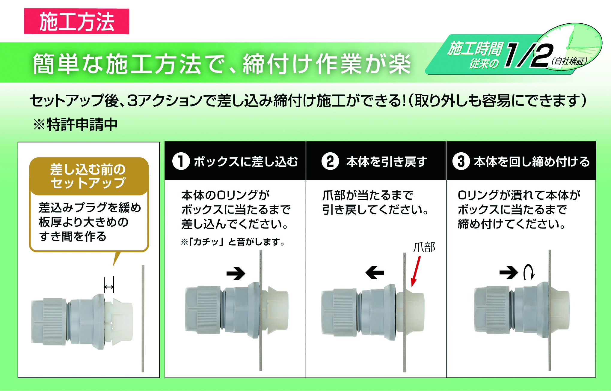 差込み式により施工方法が容易で施工時間は従来品の1/2(自社検証)で可能となります。セットアップ後に差込み締付けの3アクションで施工が完了です。取外しも容易で繰返しの接続も可能となります。ケーブル固定部は緩み止め機能がある従来品部品と共通化しております。