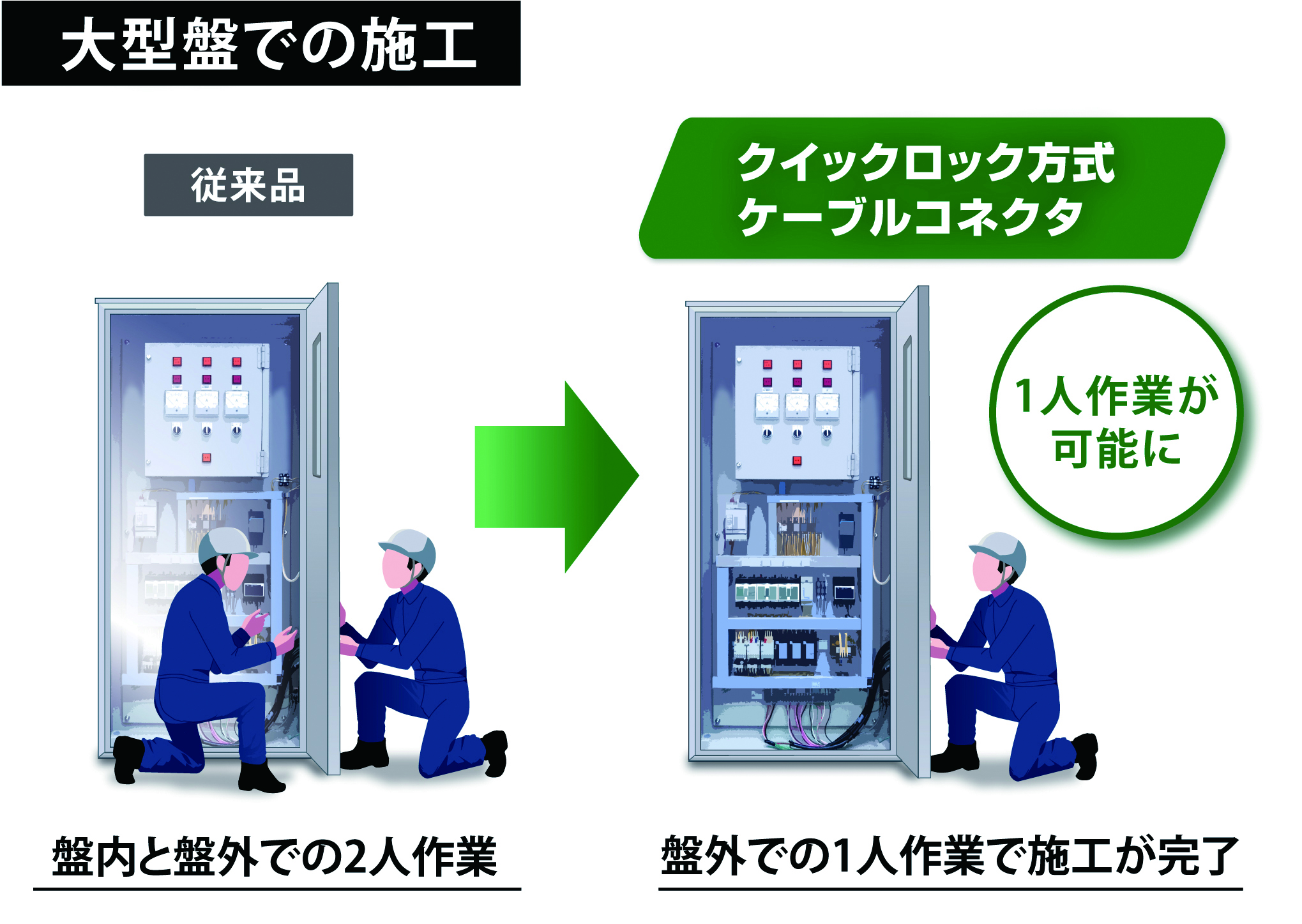 大型盤での施工時、従来は盤内・盤外での2人作業が、盤外での1人作業で施工完了ができます。施工や取り外しも容易に可能であり、高所や狭所での作業に最適となります。現場施工による施工の容易さ施工時間を短縮できることから人手不足解消・メンテナンスの容易化を実現できるため市場価値は高いと考えております。