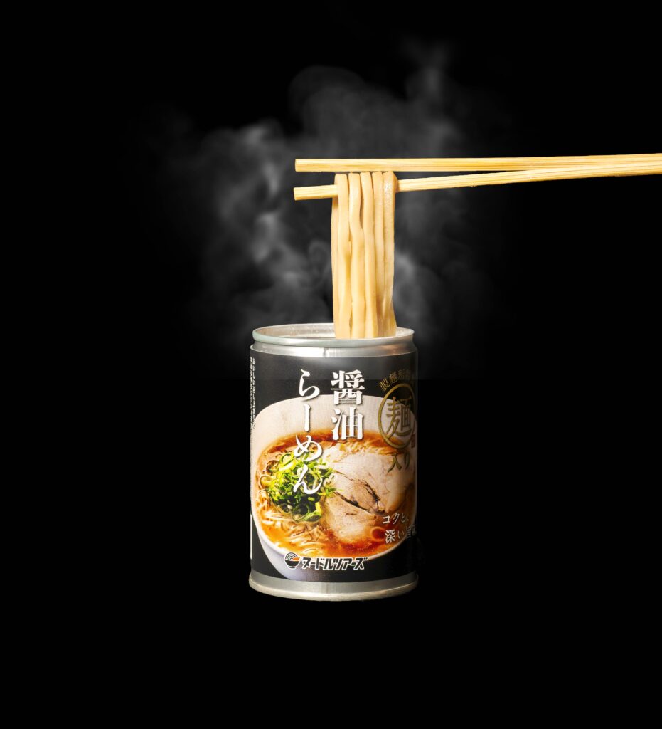業界初・小麦麺を使ったらーめん缶!独自開発した伸びにくい小麦麺使用、常温で3年保存・即食可能な本格らーめんです。