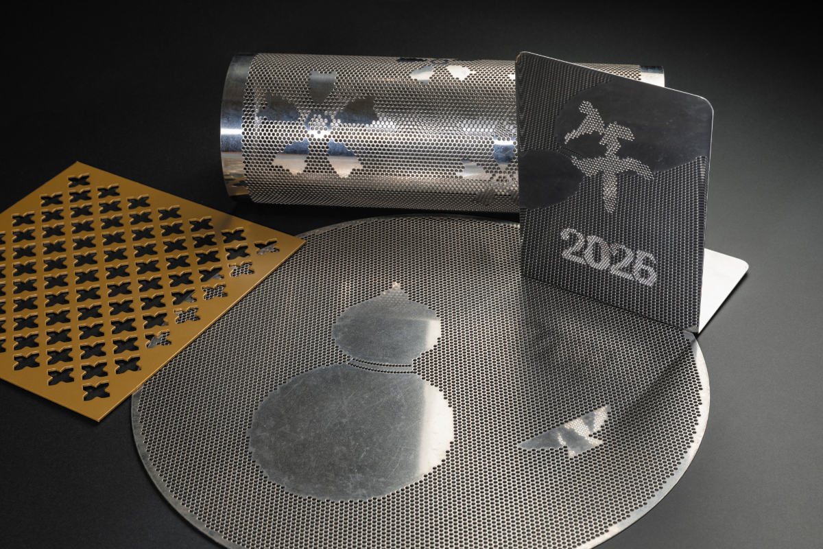 1世紀を超える伝統の技術で打抜金網「パンチングメタル」の製造・販売を行っています。工場には3タイプのプレス加工機を各2台導入し、鉄・アルミニウム・ステンレス等の板厚0.5㎜から3.2㎜に対応。丸孔、長孔、角孔、装飾孔といった多様な孔の形状・パターンや平坦度を維持した加工など、パンチングメタルに求められる条件を全てクリアしています。意匠性の高さと優れた機能性を併せ持つ当社の製品は、建材、農具、産業用機器関連など幅広い分野で採用されています。