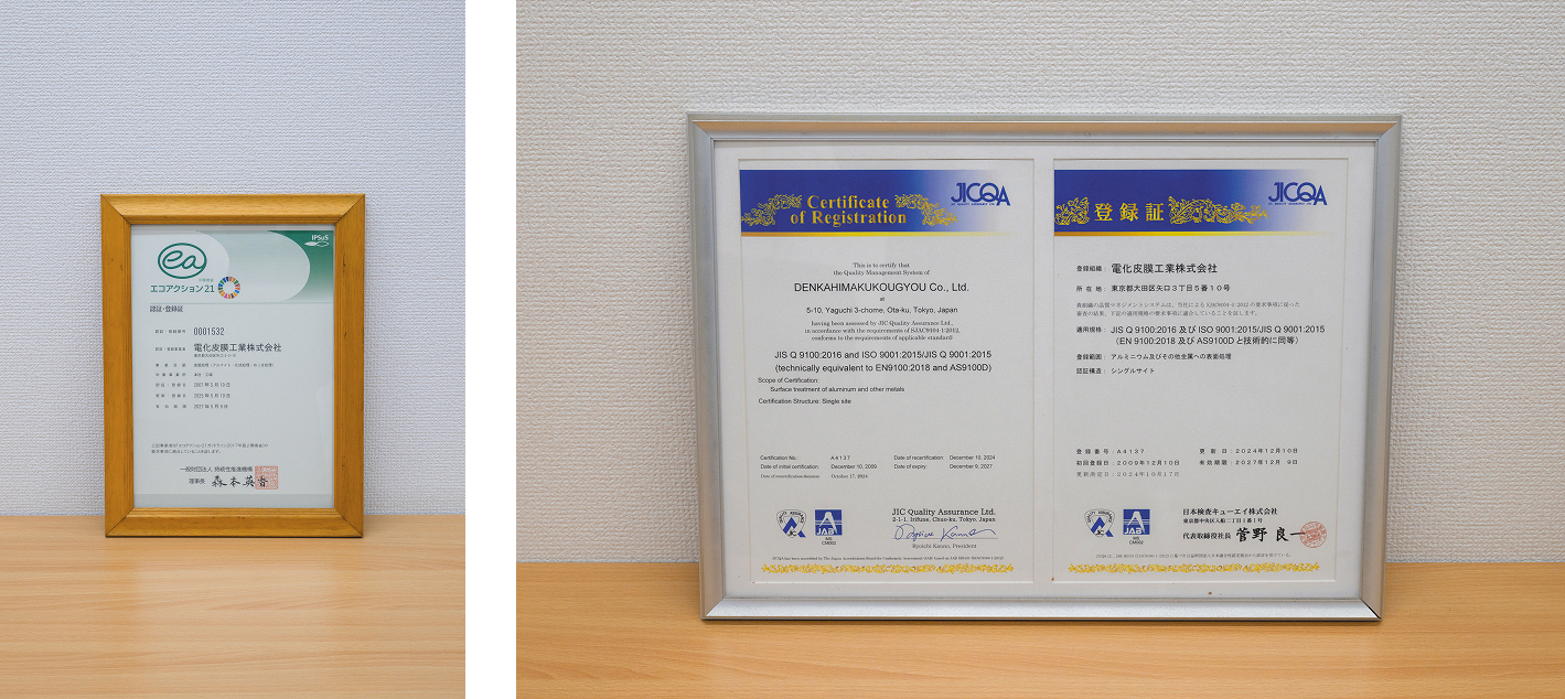 1947年の創業以来、約80年にわたり、航空部品、防衛装備品、半導体部品などに施すアルマイト化工やめっき化工等の表面処理を行っています。2009年には航空宇宙・防衛向けの品質マネジメント規格「JISQ9100」を取得。この認証を取得している企業は全国でも500社しかなく、そのうち表面処理専門企業は10社程度しか存在していません。品質要求が厳しく、処理工程のチェック項目が多い審査に毎年合格している品質の高さが強みです。